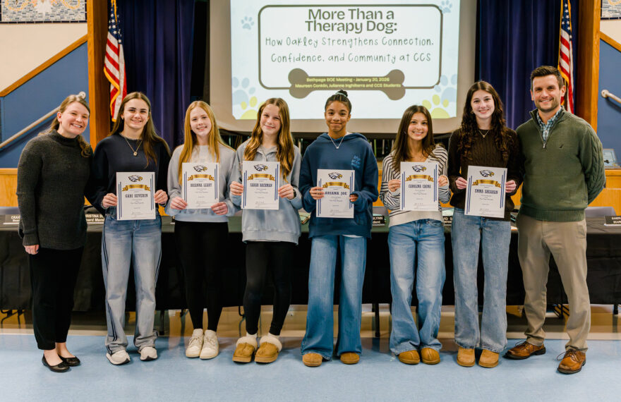 The Bethpage High School varsity girls cross-country team was recognized for its achievements this season, which include winning both county and conference championships and placing sixth in the state competition. Photos courtesy of Bethpage Union Free School District Pictured: CCS’s students pose for a photo with Oakley following their presentation. The Bethpage Board of