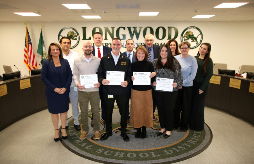 The Longwood Central School District is recognizing four Coram Elementary School staff members for their calm, coordinated, and life-saving response during a cardiac emergency involving a colleague. On December 19th, shortly before the holiday break, a staff member suddenly lost consciousness and went into cardiac arrest. Teaching Assistant Jonathan DeFelice, Nurse Doreen